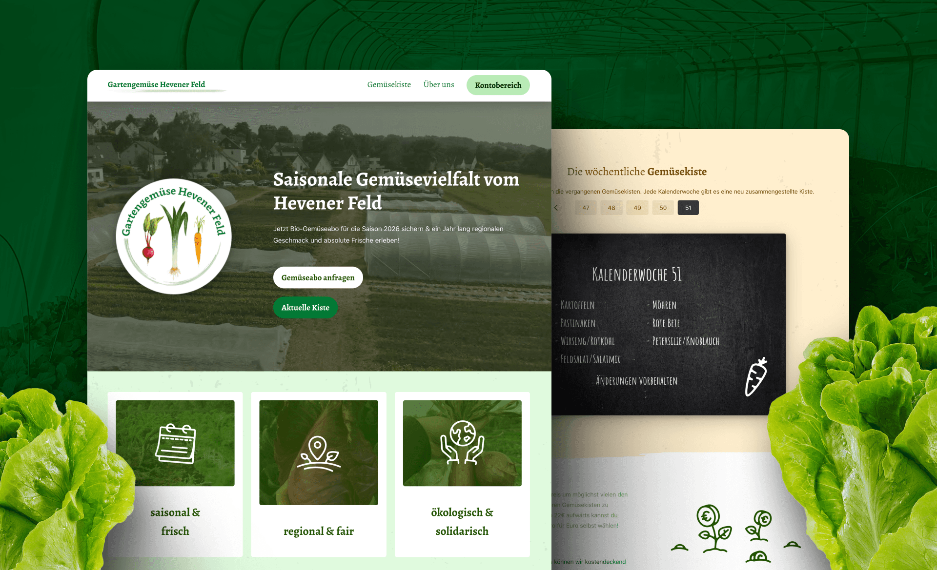 Das Gartengemüse Hevener Feld ist eine solidarische Bio-Gärtnerei in Witten-Heven, die saisonales Gemüse im Abo-Modell direkt aus regionalem Anbau anbietet. Ich gestaltete die Website inklusive Screendesign und Webgrafiken und unterstütze das Projekt seitdem regelmäßig bei weiteren Designaufgaben.